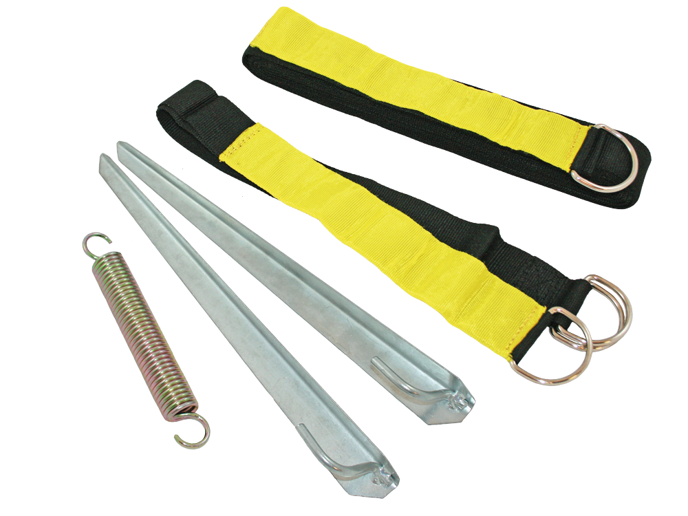 Bestehend aus zwei Gurten (100 % Polyester) mit 11 m und 1,5 m Länge, einer Spiralfeder und zwei Heringen. Optimal zur sturmsicheren Verankerung von Vorzelten und Markisen bis 7,5 m Länge.