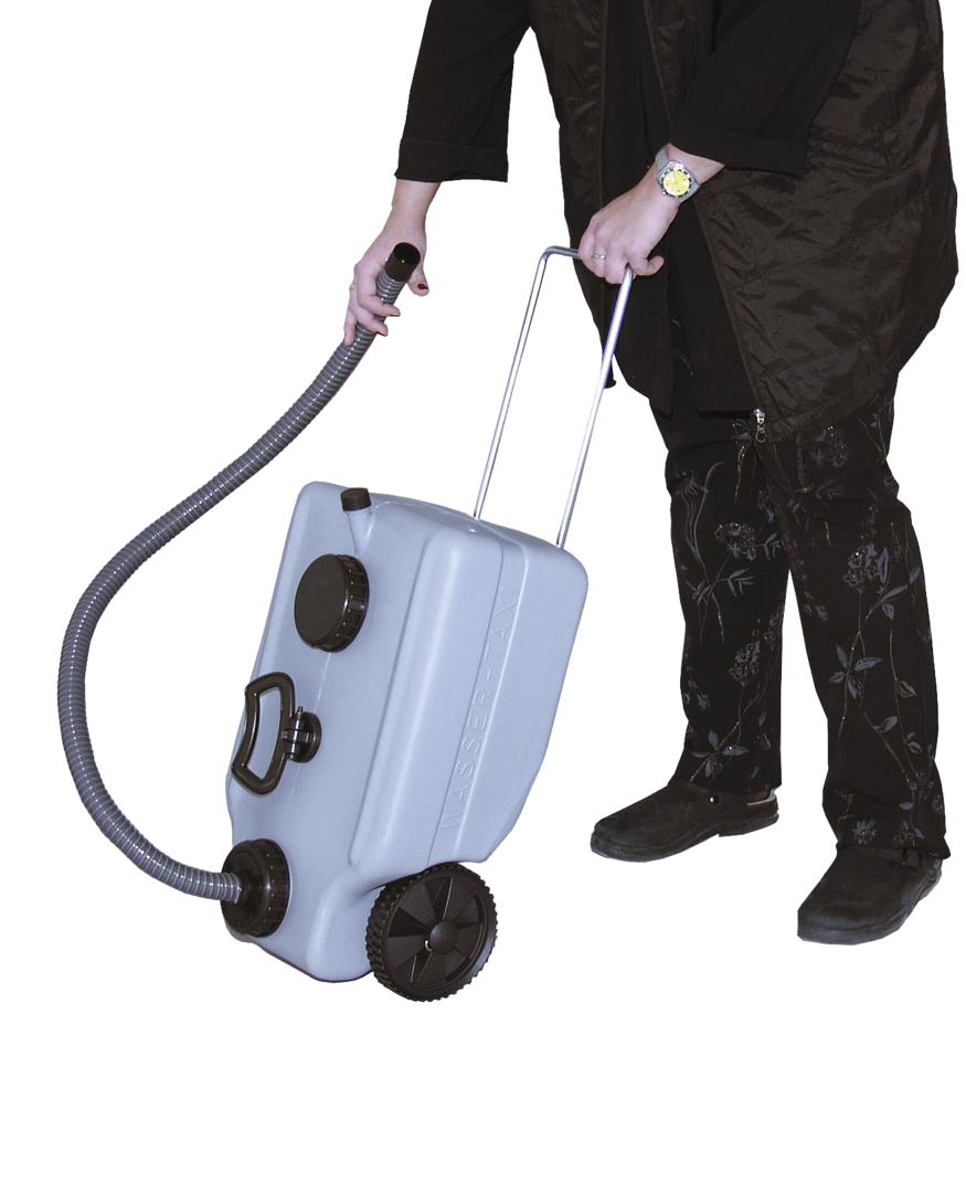 Durch herausnehmbaren Transportgriff und großen Rädern leicht zu fahren. Einfach und bequem zu entleeren. Einfüllstutzen mit ¾“ Aussengewinde. Zusätzlicher Abwasserverschluss mit 1 m Spiralschlauch und Anschlussmuffe an das Abwassersystem mit 28 mm.