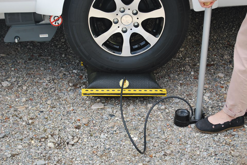 Die Handhabung ist dabei äußerst mühelos und komfortabel. Das Kissen wird einfach unter dem jeweiligen, anzuhebenden Rad platziert. Mit einer Hand-/Fußpumpe oder einem 12 V Minikompressor kann das Gefährt innerhalb von ca. 4 Minuten auf engstem Rangierraum ausnivelliert werden.