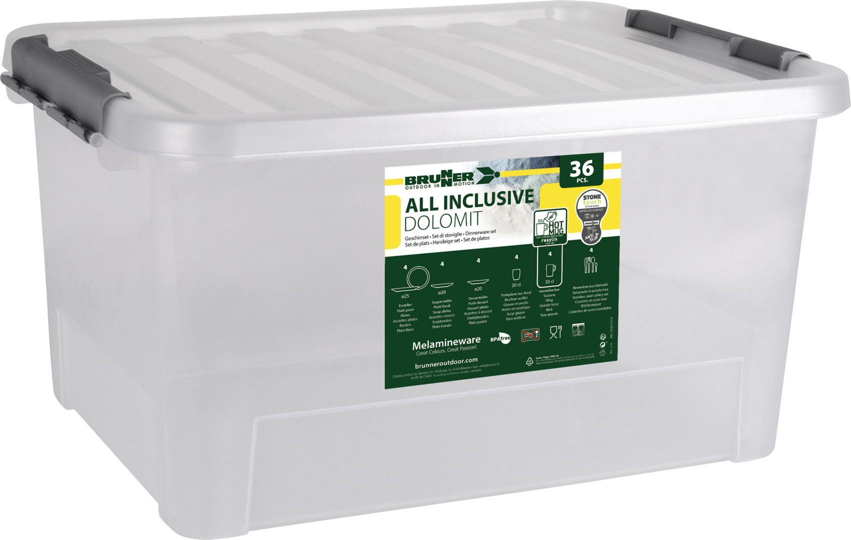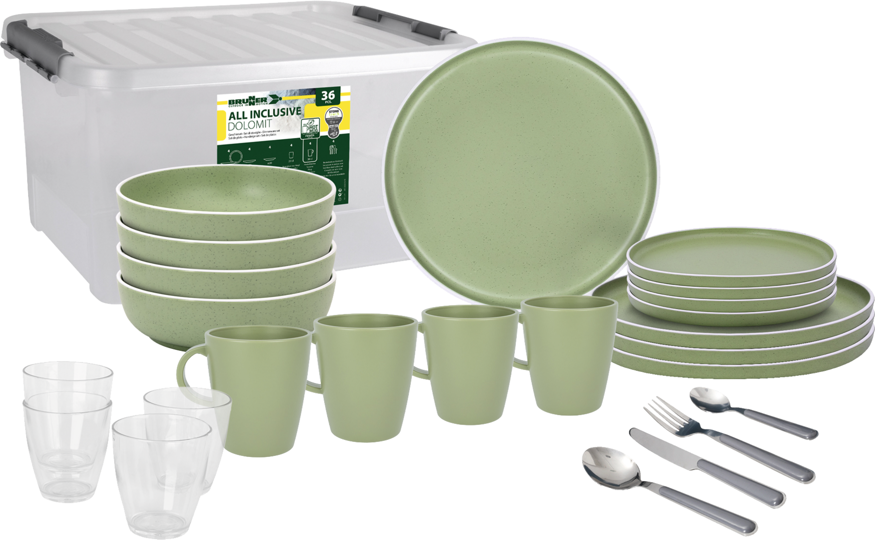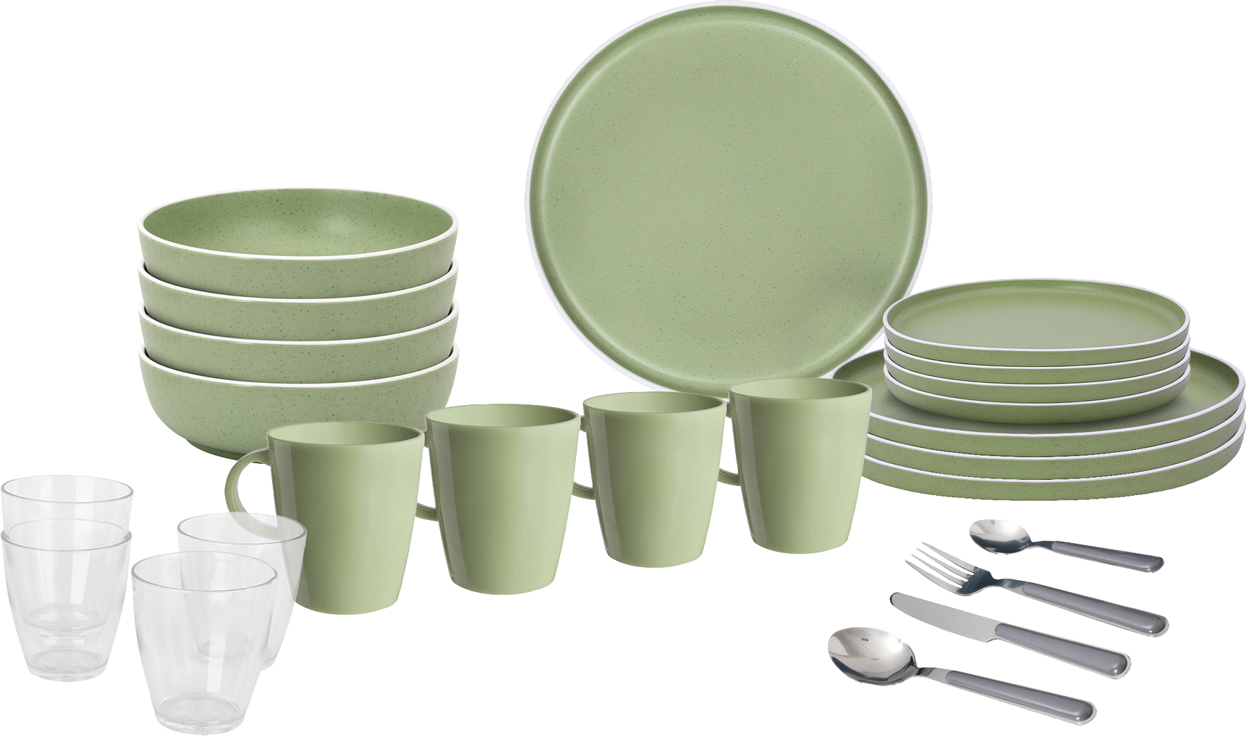 36-teiliges Melamin-Set bestehend aus 4 Esstellern ø 25 cm, 4 Desserttellern ø 20 cm, 4 Suppentellern ø 20 cm, 4 Henkelbechern 30 cl, 4 Gläsern 20 cl und 16-teiligem Besteckset