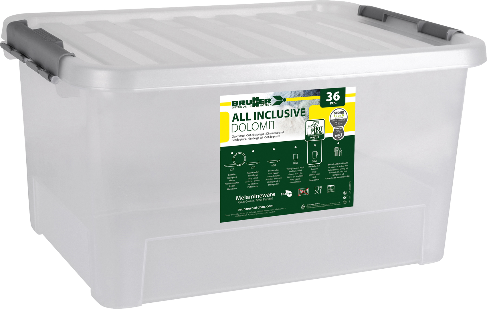 36-teiliges Melamin-Set bestehend aus 4 Esstellern ø 25 cm, 4 Desserttellern ø 20 cm, 4 Suppentellern ø 20 cm, 4 Henkelbechern 30 cl, 4 Gläsern 20 cl und 16-teiligem Besteckset