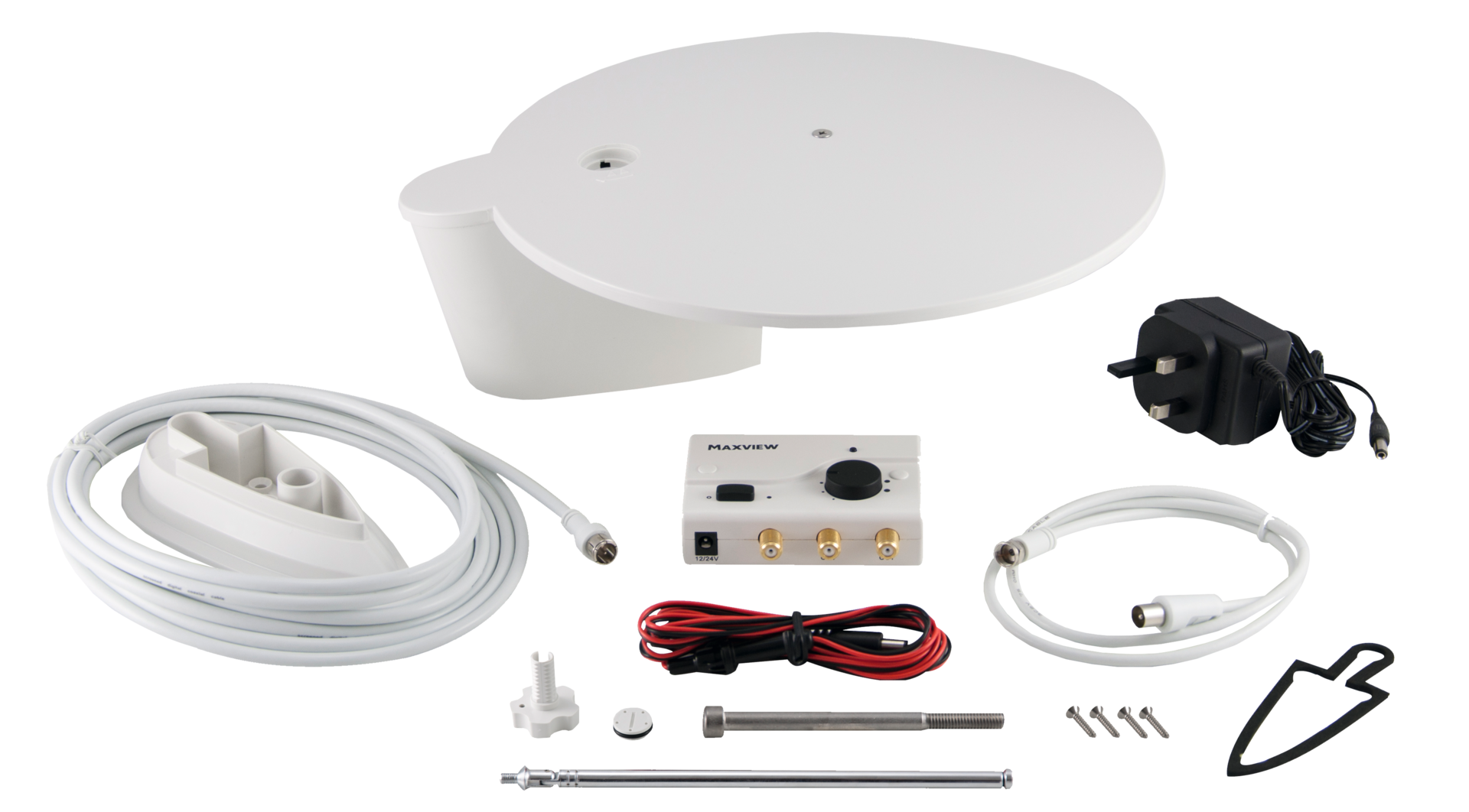 Lieferumfang: Montagefuss mit 5 m Koaxial-Kabel, Teleskopantenne für VHF, Montagematerial, 1 m Koaxial-Kabel, Klemmschraube, regelbarer Signalverstärker, 12 V-Anschlusskabel, Dichtung.