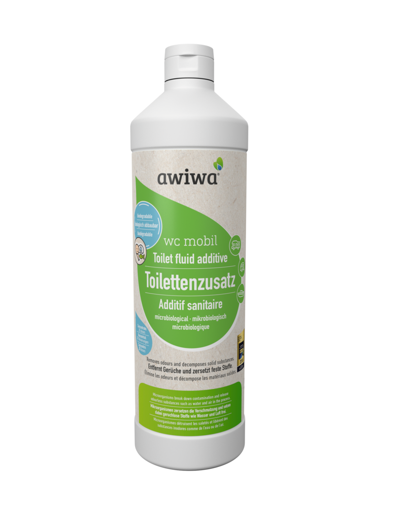 awiwa Toilettenzusatz. Der mikrobiologische awiwa Toilettenzusatz zersetzt mit seiner hochwirksamen Formel aus Enzymen und natürlichen Mikroorganismen Fäkalien und Hygienepapiere und sorgt somit für eine spritzfreie Entleerung des Fäkalientanks: Keine Klümpchen, kein Verstopfen und kein Geruch. Unangenehme Gerüche werden beseitigt und nicht überdeckt. Hygienisch sauber und chemiefrei für eine umweltbewusste Entsorgung. Der Tankinhalt kann in der Toilette entsorgt werden. Geeignet für jede mobile Toilette im Wohnmobil, Wohnwagen oder Boot. Sehr ergiebig: 1 Liter reicht für 20 Anwendungen.