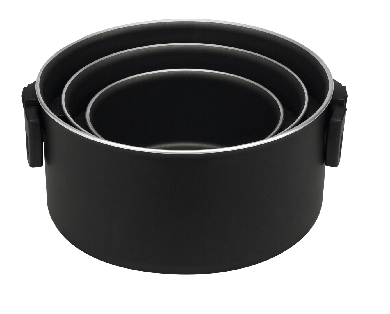 Die ideale Lösung um Platz zu sparen. Alle Griffe klappbar. Mit patentierter Sicherheitsmechanik. Alle Töpfe und Glasdeckel dank neuem Click System stapelbar. Praktisches 3er Set bestehend aus: Kochtopf mit Glasdeckel ø 16 cm – Fassungsvermögen 1,55 l, ø 20 cm – Fassungsvermögen 3,4 l und ø 24 cm – Fassungsvermögen 5,4 l,