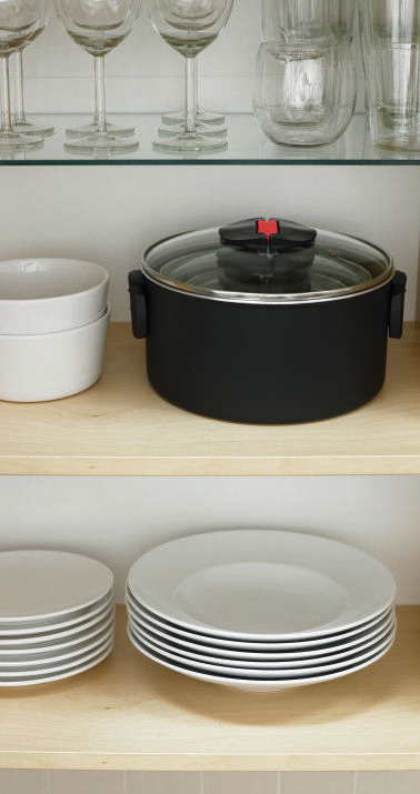 Eine revolutionäre Lösung, die Platz in der Küche spart! Abklappbare Griffe, ineinander stapelbares Kochgeschirr. Die neue Produktlinie Click & Cook von Ballarini ist vielseitig einsetzbar und platzsparend. Die Kunststoffgriffe können mit einer einfachen Bewegung eingeklappt und ausgeklappt werden. So haben Sie immer einen Platz im Küchen-schrank, Kühlschrank oder in der Geschirrspülmaschine. Da die Töpfe stapelbar sind, benötigen Sie also nur einen Stauraum von 12 cm in der Höhe. Die patentierte Arretie-rungsvorrichtung der Griffe erlaubt sicherste Handhabung während des Kochens. Beschichtung innen: 3-fach keramisch verstärkte Antihaftversiegelung KERAVIS. Beschich-tung außen: Pulverbeschichtet.