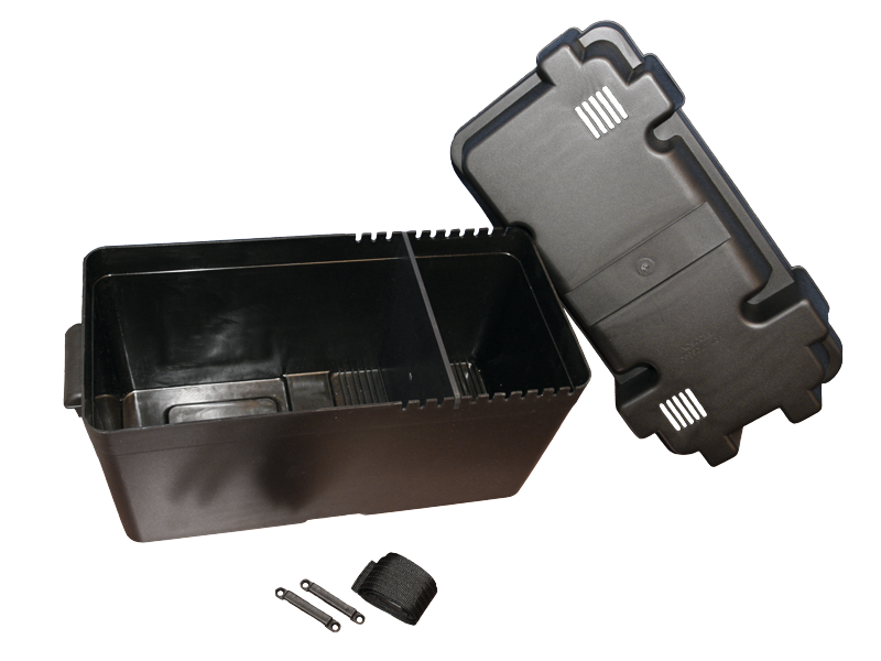 Zum sicheren und sauberen Aufbewahren der Batterien. Aus Kunststoff, mit einsetzbarer Trennwand und Befestigungsgurten.