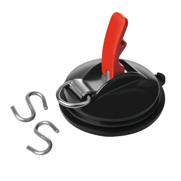 Schraubenlose Befestigung von Vorzelten/Buszelten, Sonnendächern, Sonnensegeln, u. v. m. Der Saugnapf wird einfach auf einer glatten, sauberen und trockenen Fahrzeugfläche angesetzt und der Hebel umgelegt, dadurch wird ein sehr starkes Vakuum erzeugt.