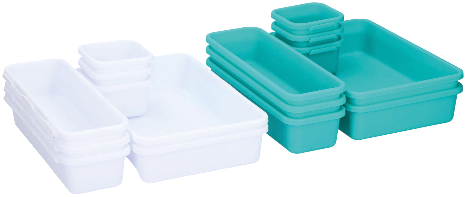 8-teiliges Set bestehend aus 2 Fächern 15,5 x 23,5 x 4,5 cm, 3 Fächern 7,5 x 23,5 x 4,5 cm und 3 Fächern 7,5 x 7,5 x 4,5 cm.
