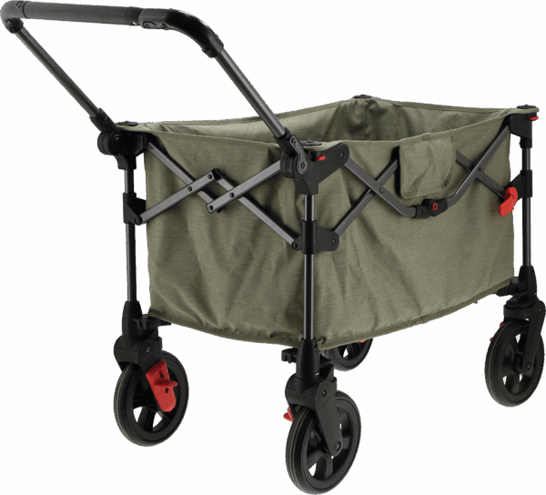Mit positionierbarem Schiebegriff, 2 schwenkbaren Rädern an der Vorderseite, feststehenden Rädern mit Bremsen an der Hinterseite und praktischen Ablagefächern. Leicht und kompakt zusammenklappbar.