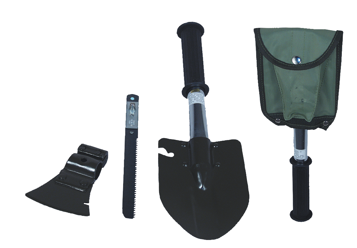 Camping-Werkzeug-Set. Bestehend aus Spaten, Beil, Hammer, Säge und Kapselheber. Inklusive Gürteltasche.