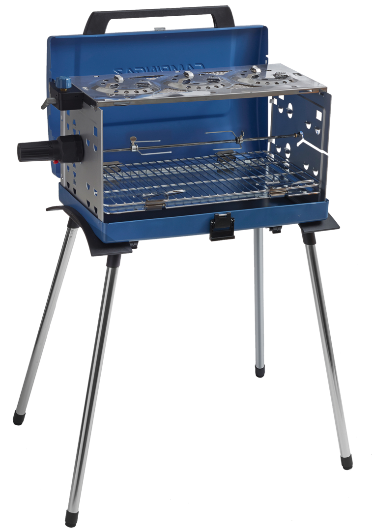 Die drei Flammen oben dienen als Herdplatten, während darunter ein Hähnchen am Spieß oder leckerer Fisch auf dem Grillrost gegrillt wird. Der Koffergasgrill ist ein kompaktes, vielseitig einsetzbares Kochgerät für jeden Urlaub, voll ausgestattet, mit praktischen Details und verpackt in ein modernes Design.