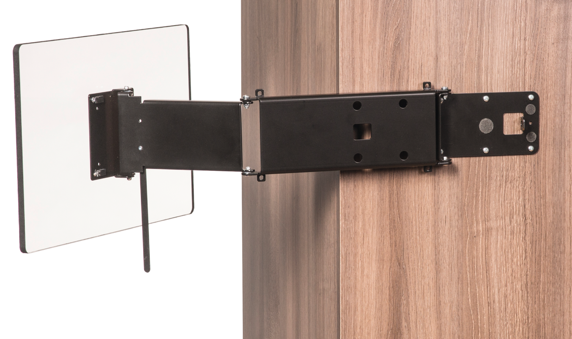 Kompakte Halterung mit drei Drehpunkten und sehr großem Schwenkbereich.