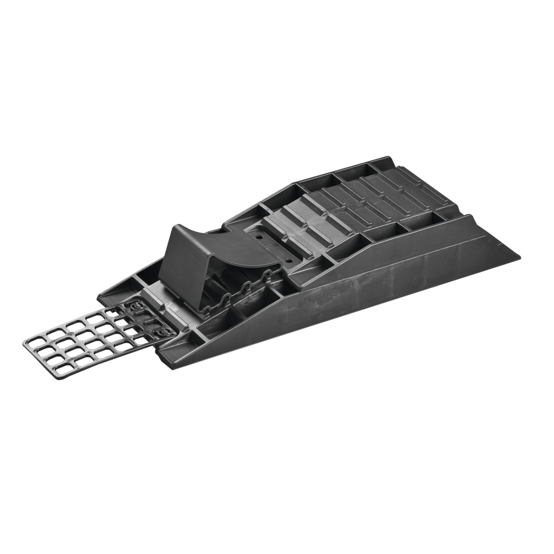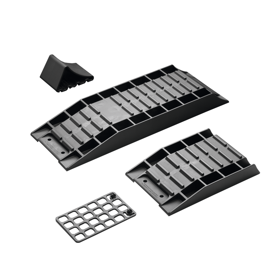 4-teiliges Set, schwarz, bestehend aus 1 Ausgleichskeil 2-teilig, 1 Auffahrhilfe und 1 Parkstopper.