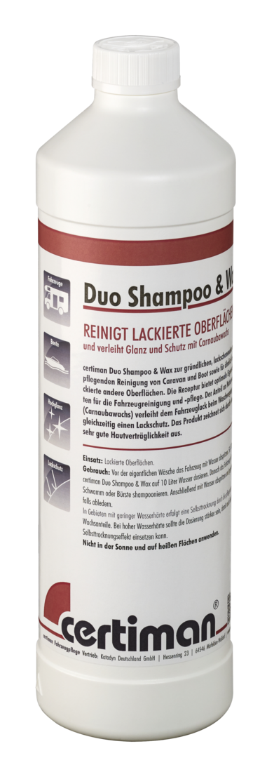 certiman® Duo Shampoo & Wax. Geeignet für eine gründliche, lackschonende und pflegende Reinigung von Caravan und Boot, sowie für ähnlich lackierte Oberflächen. Dank Naturwachs wird dem Fahrzeuglack beim Waschvorgang gleichzeitig ein Lackschutz verliehen. 1000 ml Flasche.