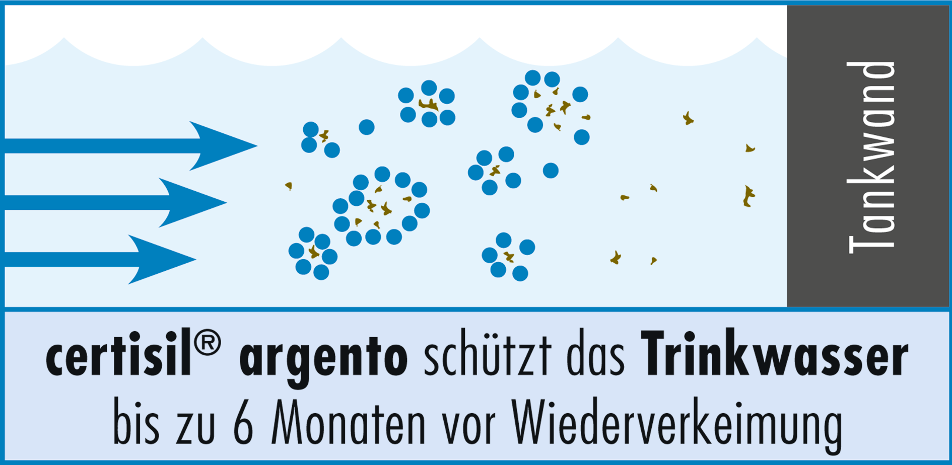 Bei Stillstandzeiten Tank und Leitungen ganz mit Trinkwasser auffüllen und mit certisil® argento vor Wiederverkeimung schützen.
