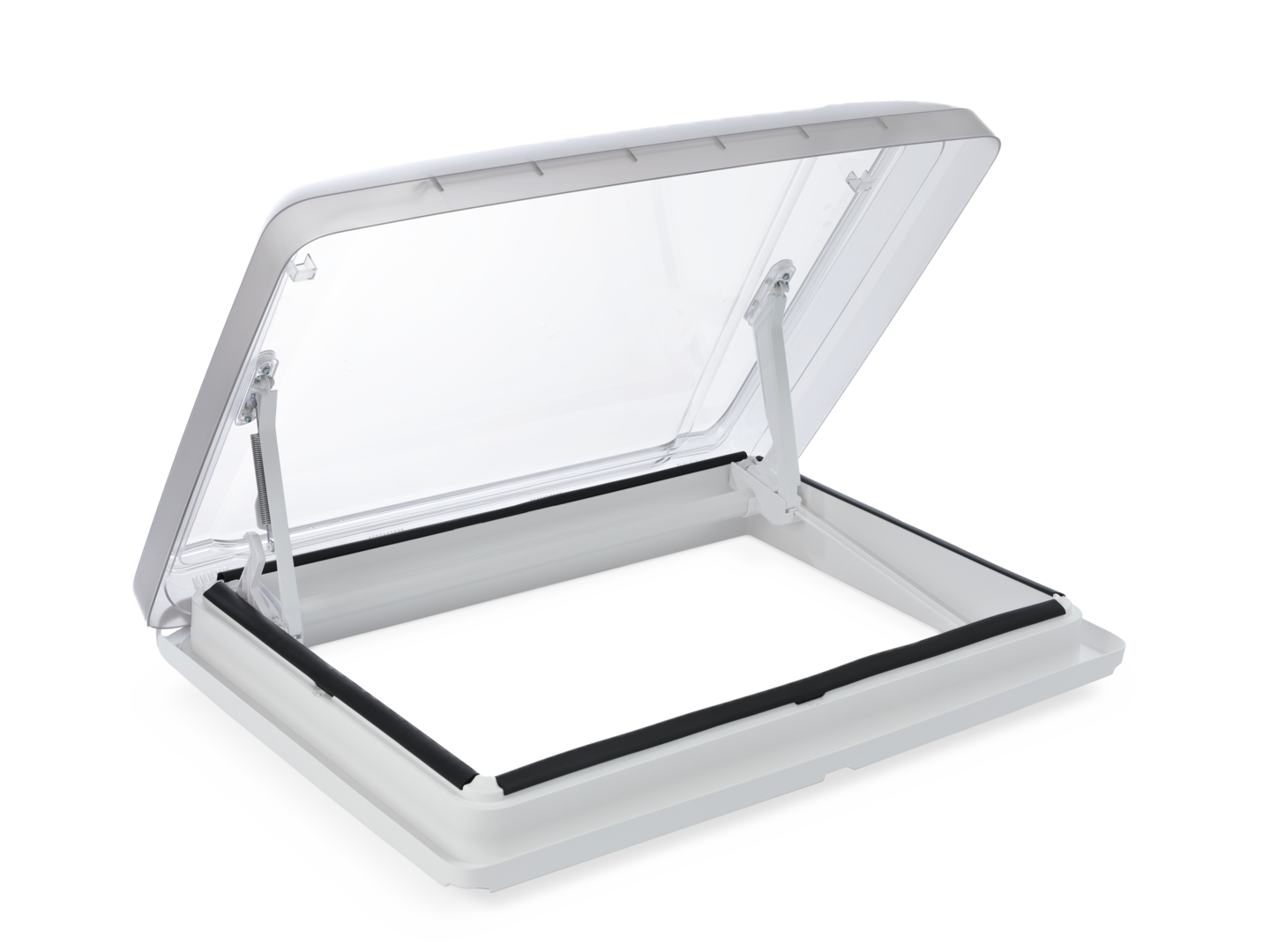 Bedienfreundliche Dachhaube mit robuster Doppelverglasung und Bügelaufsteller, moderner Innenrahmen mit Doppelplissee.