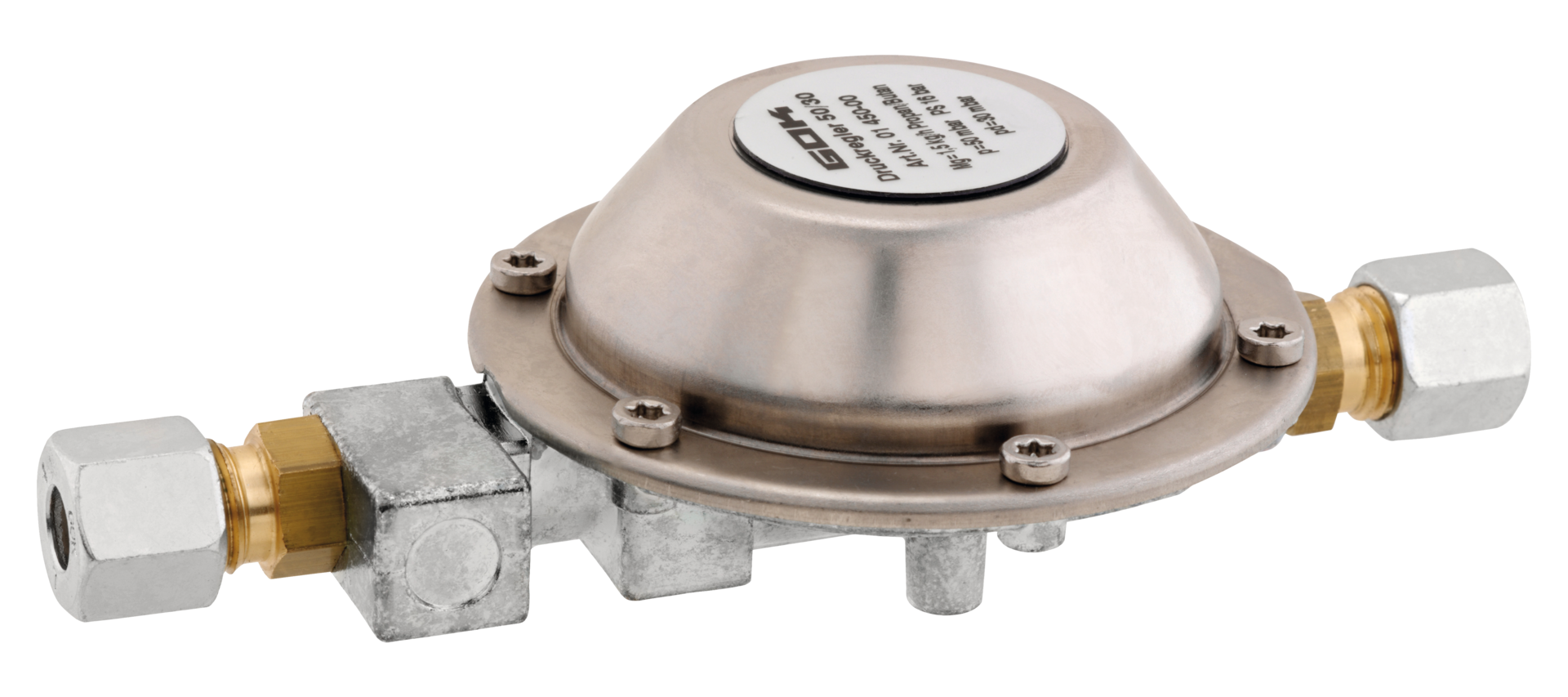 Der Niederdruckregler wird in die Standleitung vor dem Fahrzeug montiert und regelt den Druck von 50 auf 30 mbar.