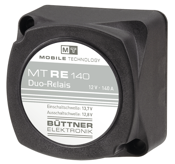 Spannungsabhängiges Trennrelais mit 140 A Schaltleistung. Steigt die Spannung der Starterbatterie an (Motor läuft), wird die Bordbatterie mitgeladen.