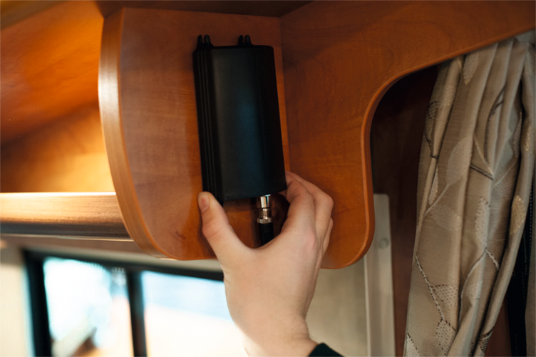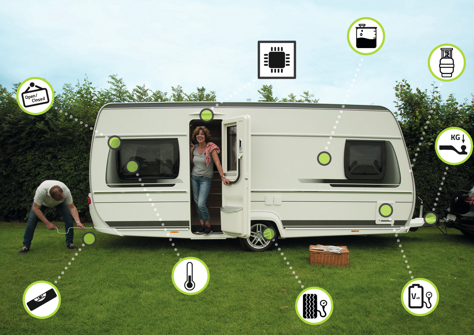 Mit diesem Starterpaket haben die Besitzer von Wohnwagen und Wohnmobilen den Ladezustand ihrer Wohnraumbatterie und die Neigung ihres Fahrzeugs mit dem Smartphone im Blick.