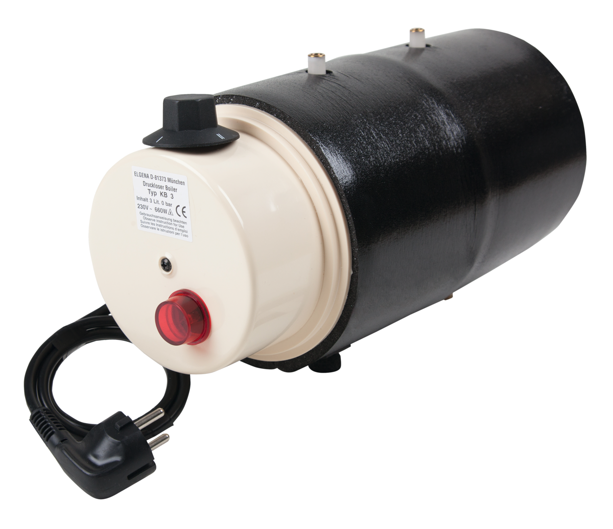 Betriebsdruck 0 – 3 bar, Heizelement und Wasserbehälter Edelstahl V4A, Isolierung EPP, Wasseranschluss ø 10 mm, Spannung/Leistung 230 V/500 W.