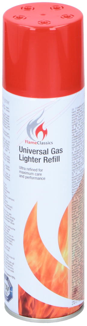 Feuerzeuggas Nachfülldose. TÜV geprüft. Abmessungen ø 5 x 20 cm. Inhalt 250 ml.