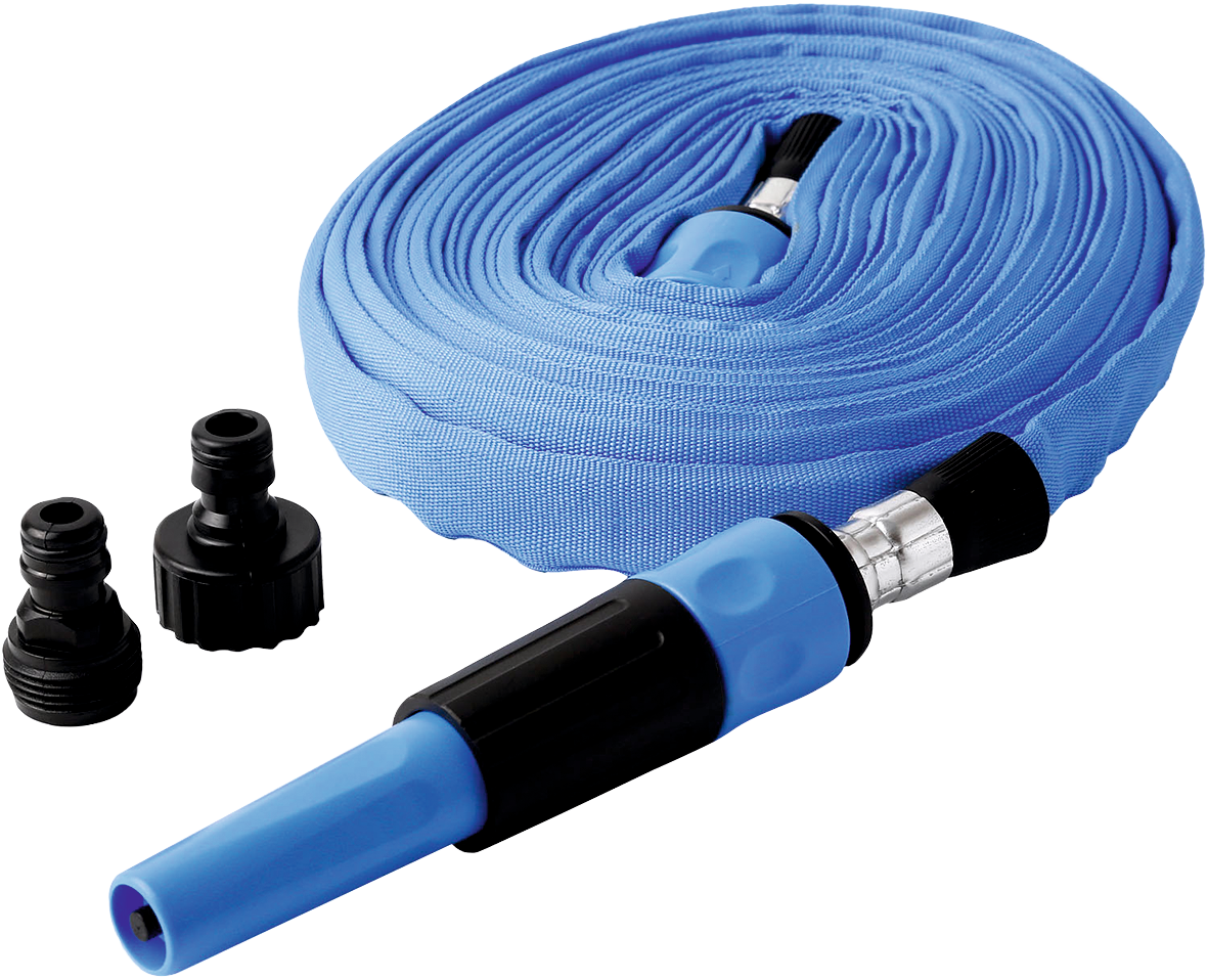 Flachschlauch aus robustem, ausfransungsbeständigem Material. Komplett mit Anschlussteilen. Schlauchlänge 9 m.