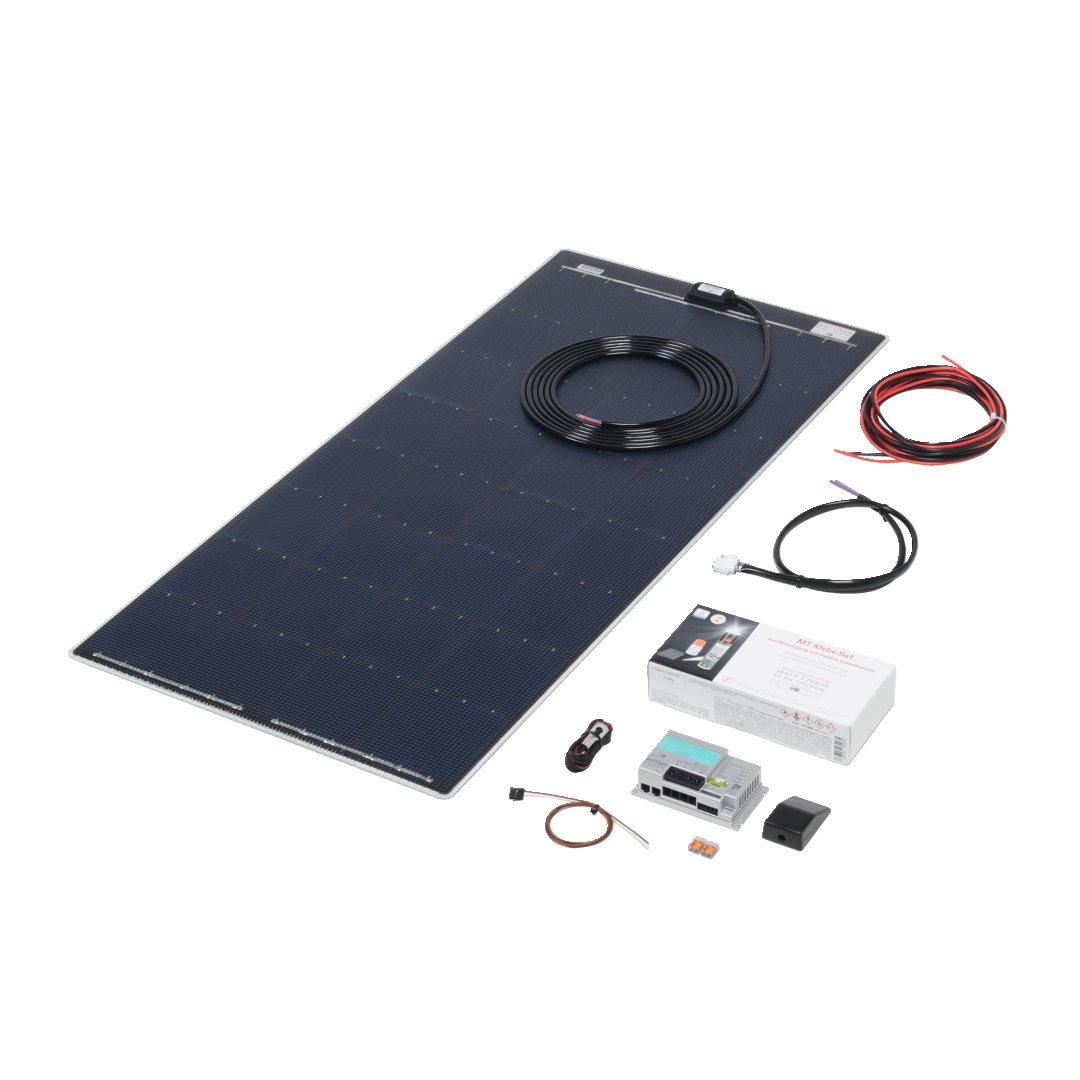 Ein extrem leichtes Solarmodul und geringe Aufbauhöhe bei kompakten Abmessungen wurde hier optimal umgesetzt. Die Dachdurchführung ist absolut druckwasserdicht und wie auch das Solarmodul bei flächiger Verklebung voll begehbar. Durch die hochbeständige Oberfläche sind die Hochleistungszellen optimal geschützt und können auch auf leicht gewölbte Dachflächen aufgeklebt werden. Den Komplettanlagen liegt auch das komplette Klebezubehör sowie ein MT Solarregler bei. Dieser ist mit einem Temperaturfühler für die Bordbatterie augestattet und verfügt über die neuesten Kennlinien, die auf Flüssig-/AGM-/Gel- und LiFePO4-Batterien eingestellt werden können.