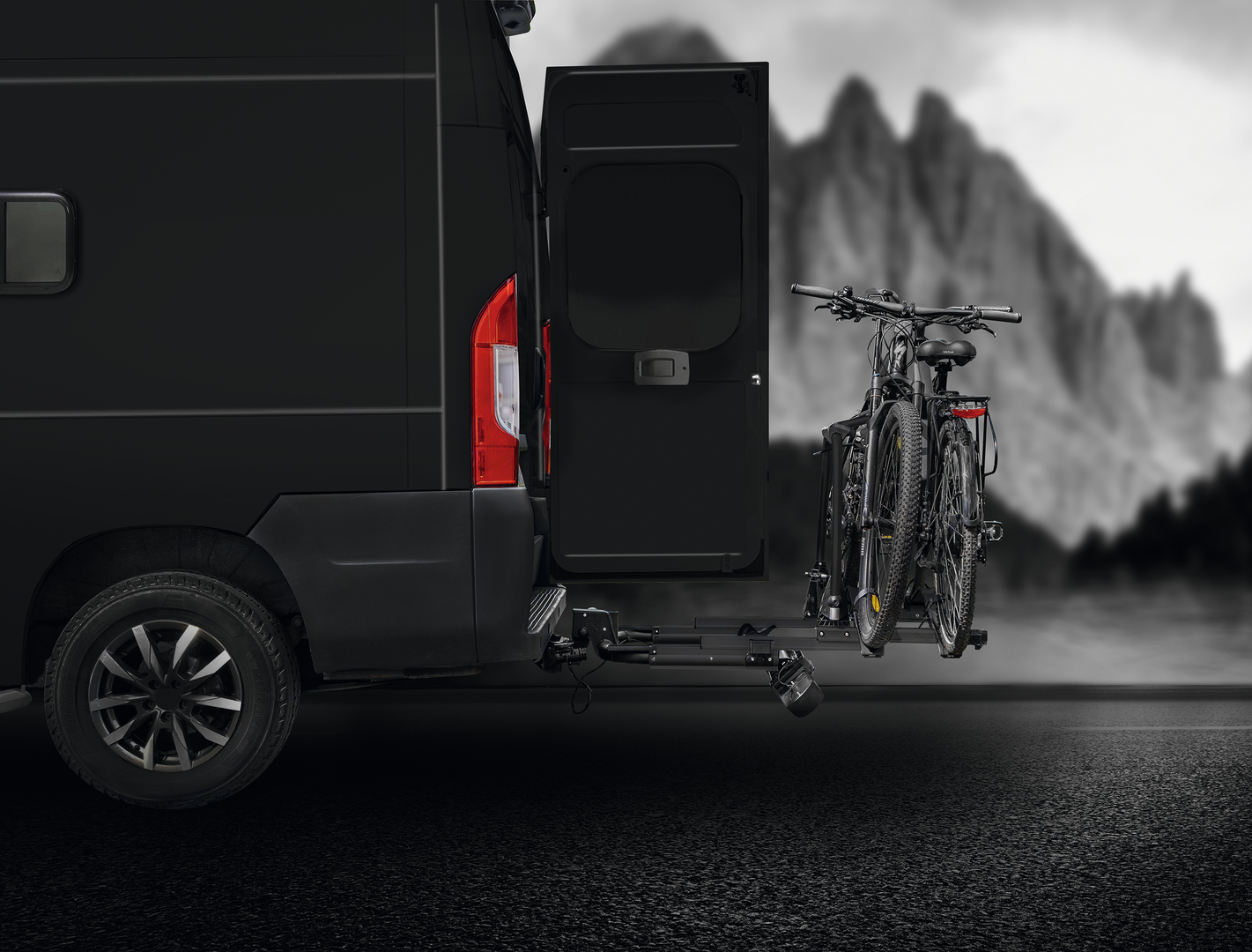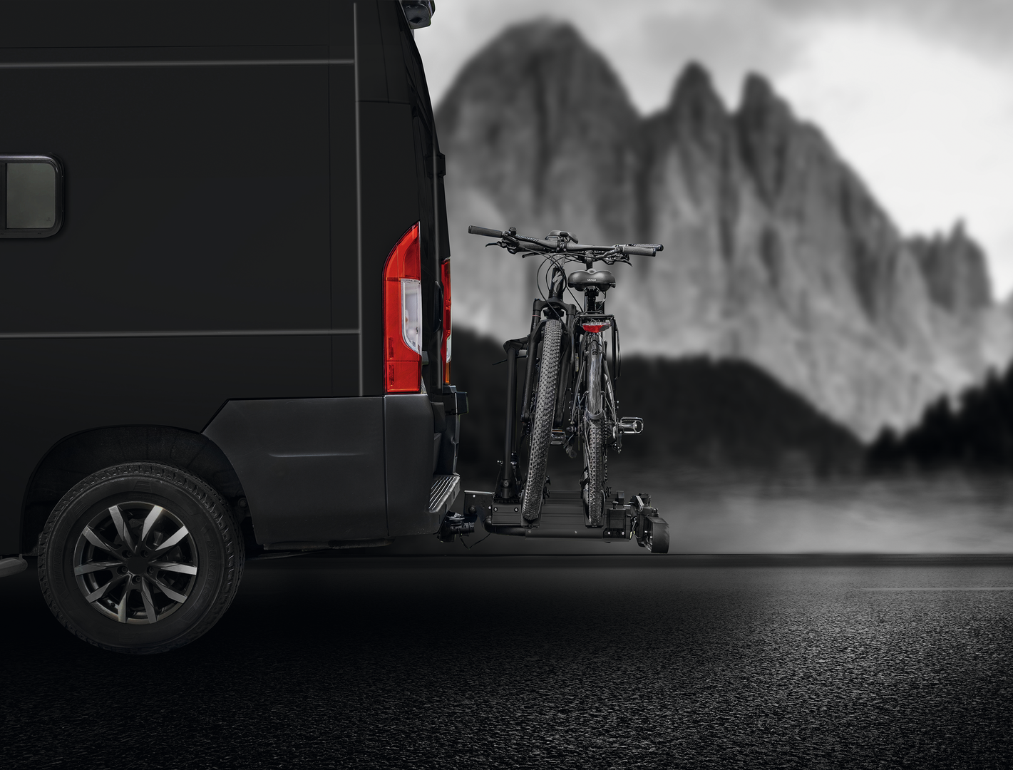 Zum Transportieren von Fahrrädern auf der Anhängerkupplung speziell für Kastenwagen und Wohnmobile, Familienbusse, Hochdachkombis mit Flügeltüren sowie PKWs.