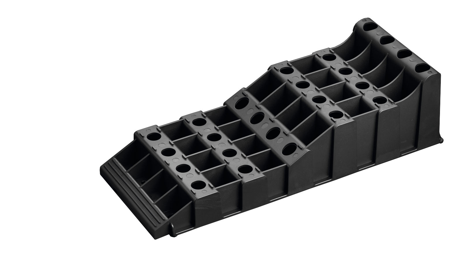 Auffahren in 2 Höhen: 65 mm und 115 mm. Auffahrfläche 535 x 235 mm, Höhe 150 mm. Der Stufenkeil XL vereinfacht sicheres Auffahren und stabilen Stand auf einer großen Fläche.