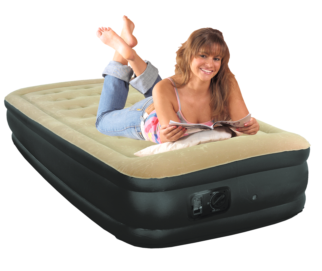 Gästebett Deluxe. Extra hohe Liegefläche, erhöhtes Kopfteil, beflockte Oberseite. Mit integrierter 230 V-Elektropumpe. Inklusive Tragetasche. Material 100 % Polyvinylchlorid.