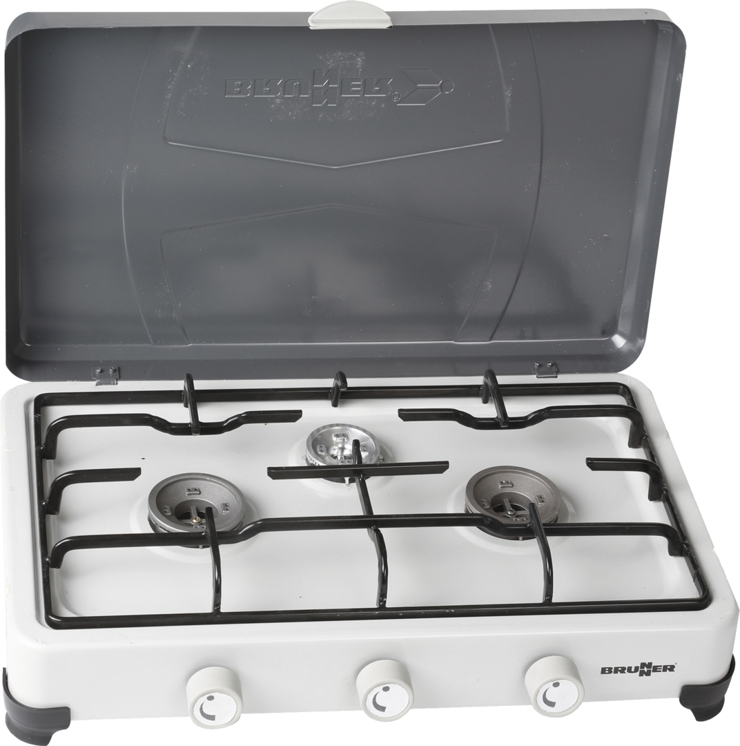 Dreiflamm-Gaskocher mit pulverbeschichtetem Metallgehäuse und Deckel.
