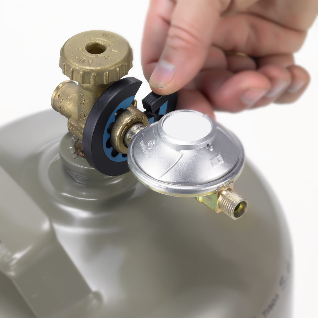 Durch Aufklappen des GASLOCK® kann spielend leicht der Flaschenregler an das Flaschenventil an- und wieder abgeschraubt werden.