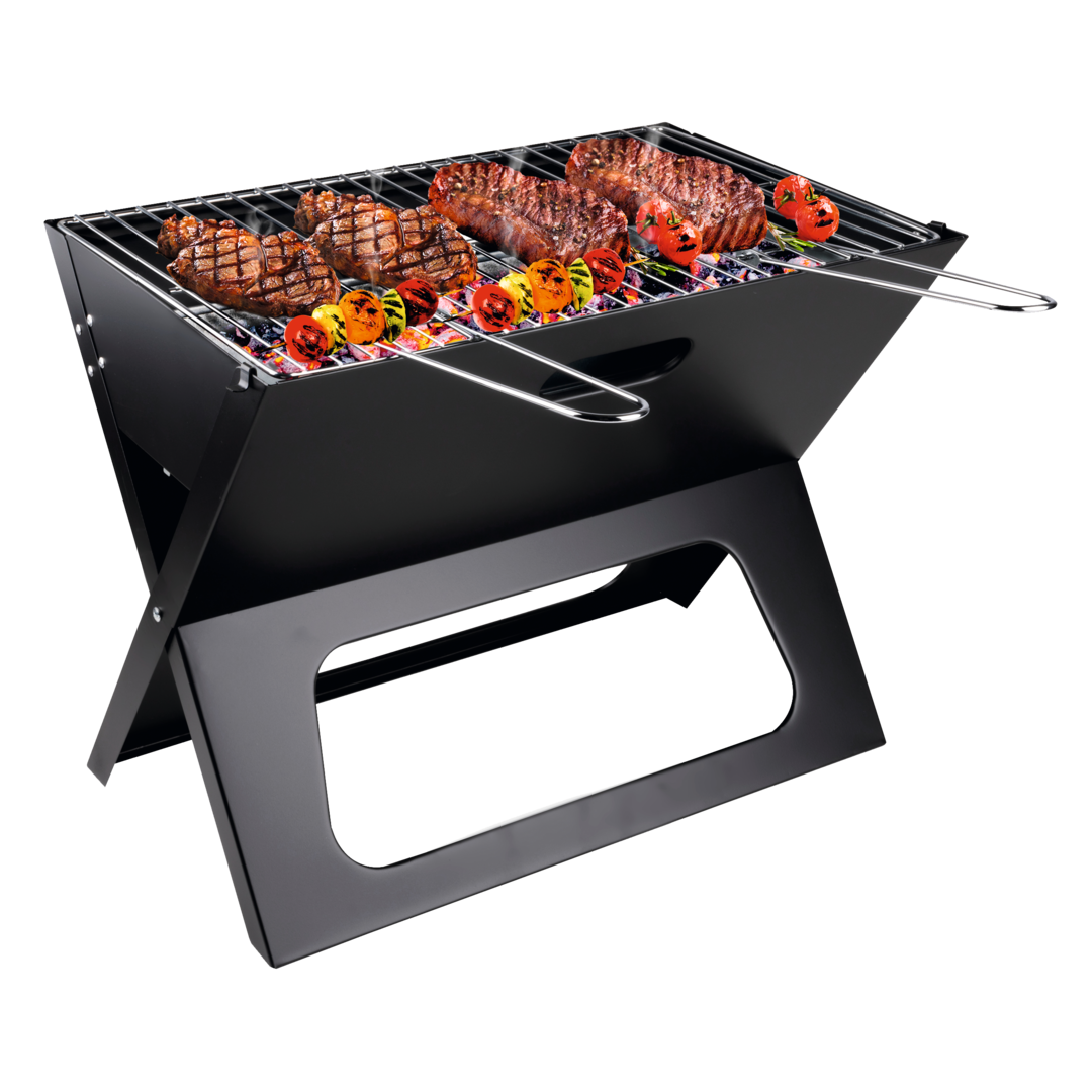 Dieser schwarze tragbare Grill lässt sich zu einem flachen Paket zusammenfalten und ist an den praktischen Griffen leicht zu transportieren.