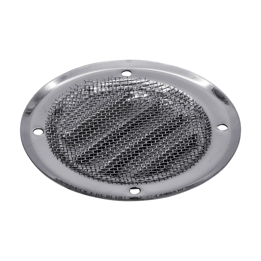 Edelstahl-Kiemengitter mit Fliegengitter zur Abdeckung der Entlüftungsöffnung. Der angegebene Durchmesser bezieht sich jeweils auf den Außendurchmesser des Gitters.