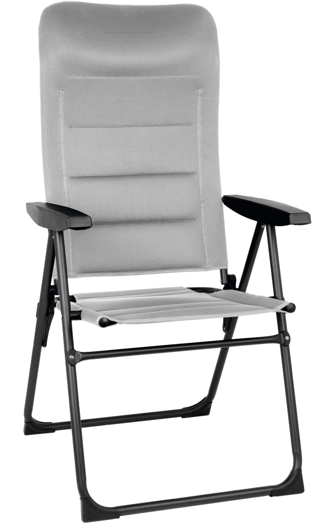 Klappsessel SKYE RT. Hochwertiger klappbarer Campingstuhl mit hoher, in 8 Positionen verstellbarer Rückenlehne und klassischem U-förmigen Bügelfuss-Gestell, das auch auf weichem Boden sicheren Stand garantiert. Das kompakte, klappbare Gestell ist aus pulverbeschichtetem Aluminiumrohr gefertigt, das in Kombination mit der strapa-zierfähigen 3D-Gewebe-Sitzfläche (100 % Polyester) einen stabilen und sehr bequemen Sitz garantiert.