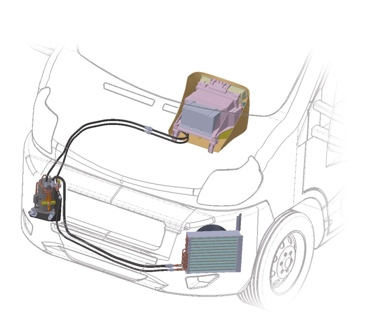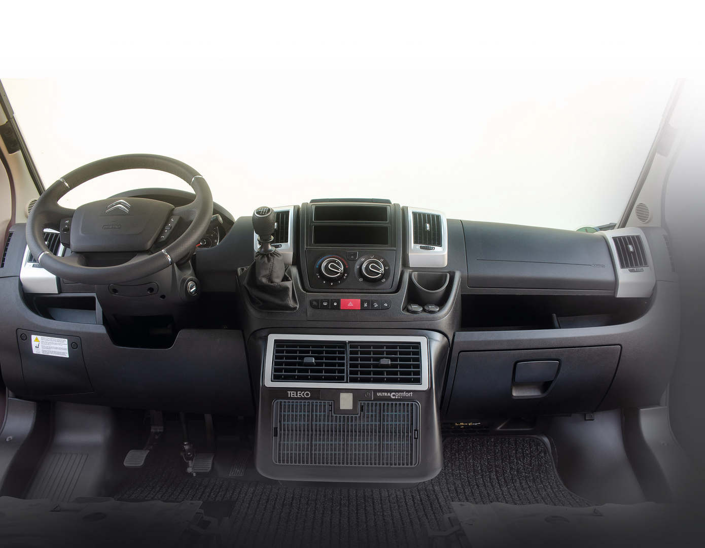 Eine neue und innovative Konstruktion verlagert die Klimaanlagen für Wohnmobile vom Dach in den Motorraum, mit dem Diffusor unter dem Armaturenbrett.