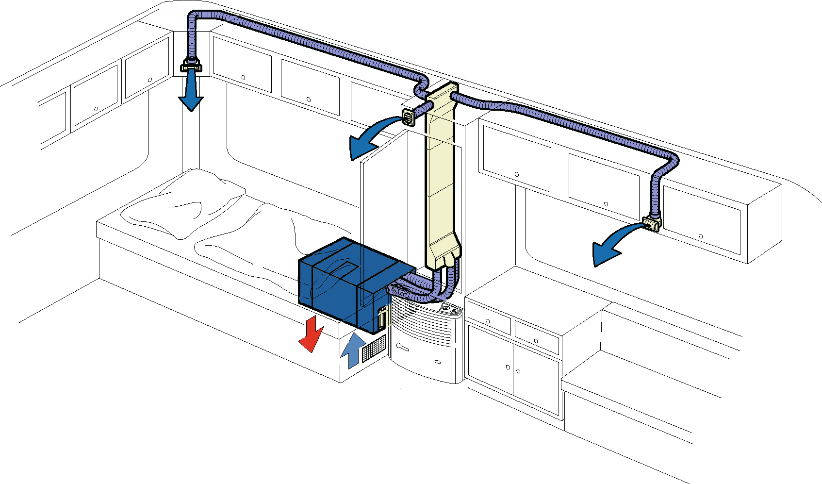 Mit dieser Lösung können Sie getrennte Wohn- und Schlafbereiche individuell mit kühler Luft versorgen. Durch verstellbare Ausströmer dosieren Sie gezielt, wie viel gekühlte und gereinigte Luft wohin strömt.