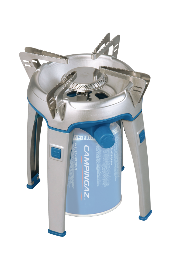 Trekking-Kocher mit vier abnehmbaren Beinen, Piezozündung und Easy Clic® Plus-Verschluss.