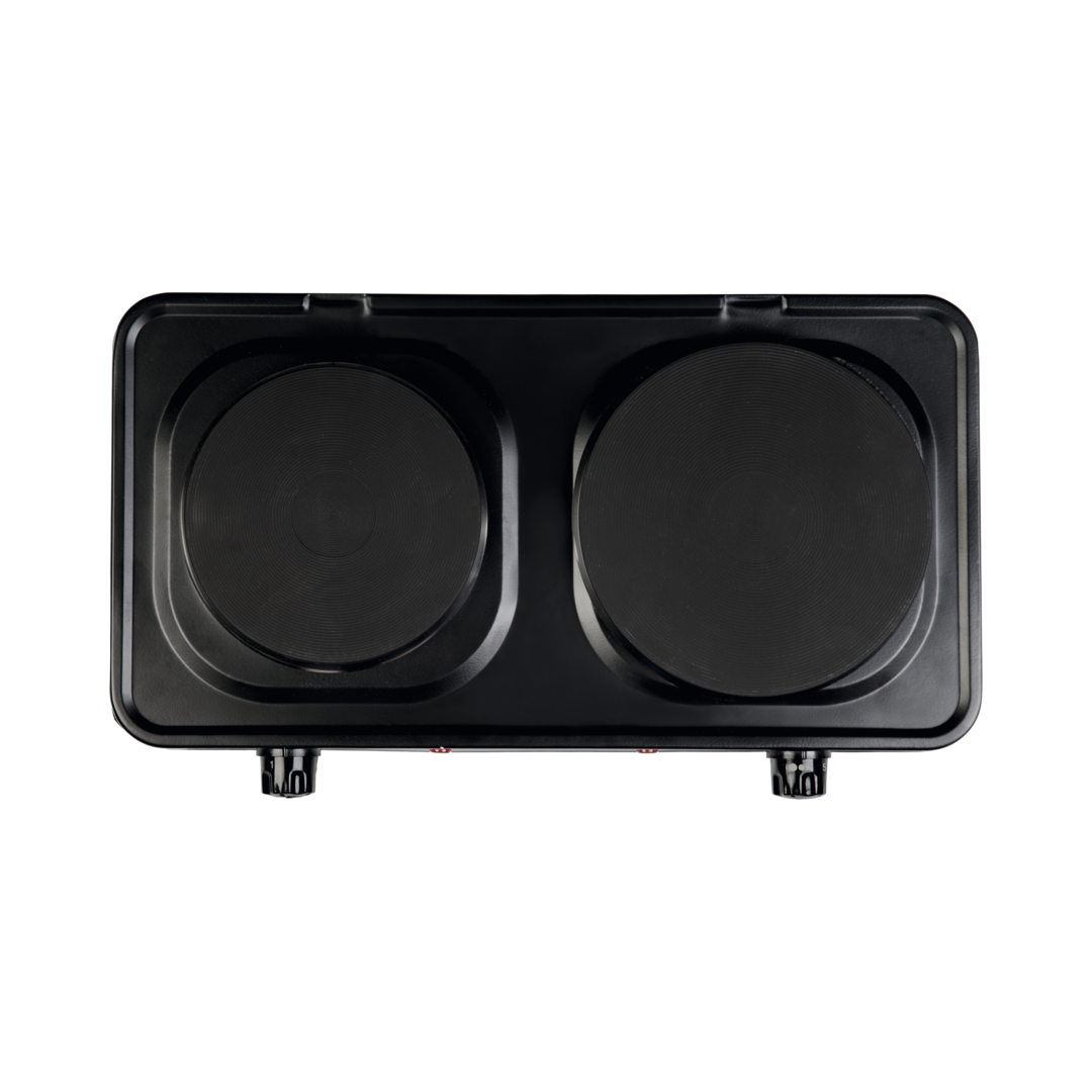 Elektrische Kochplatten mit einstellbarem Thermostat, hitzbeständigem Gehäuse, Überhitzungsschutz, roter Kontrollleuchte und Anti-Rutsch-Füßen.