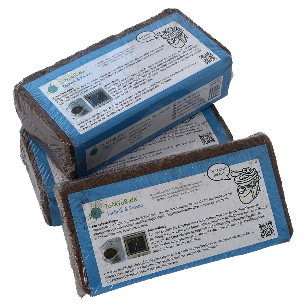 Kokosfaserziegel. Substrat für Komposttoiletten. Aus gepresster und getrockneter Kokosfaser. Rein biologisch, unverderblich, sehr lange lagerfähig, ungedüngt, frei von Steinen. Muss vor Verwendung aufquellen!