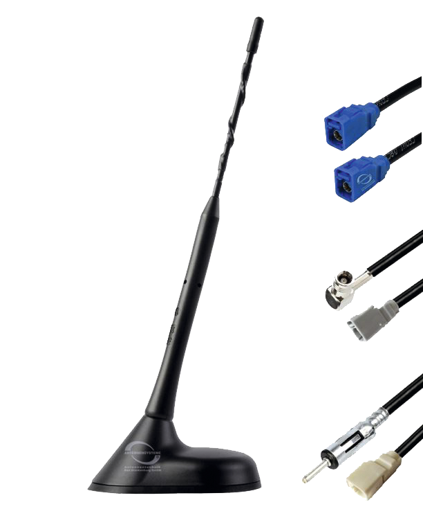 23 cm Antennenstab, 12 V-Stromversorgung der FM/ DAB Verstärker über Innenleiter oder externen Kabelanschluss mit DIN-Steckhülse, inklusive je 6,5 m FM (DIN), DAB+ (SMB) und GNSS (FAKRA) Anschlusskabel.