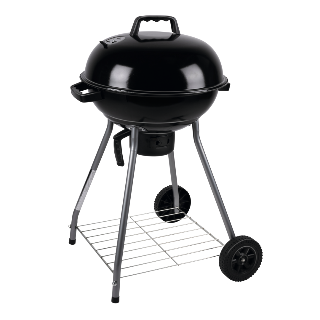 Dieser Holzkohle Kugelgrill besitzt einen Entlüfter, einen herausnehmbaren Aschefänger, Tragegriffe sowie ein Untergestell mit zwei Rädern und einem Ablagegitter für Grillutensilien.