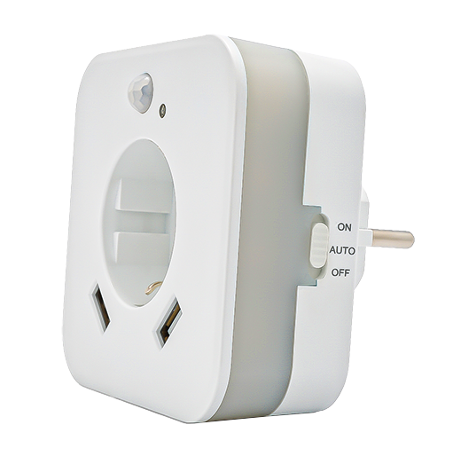 Technische Daten: Lichtfarbe 2700K, Leistung 0,3 W, Steckdose max. 3.680 W – 230 V, 2 x USB 2,4 A, Sensor Reichweite 3 m,