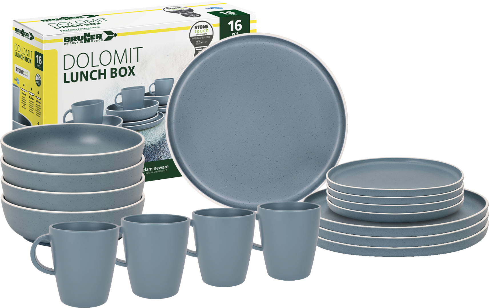 16-teiliges Melamin-Set bestehend aus 4 Esstellern ø 25 cm, 4 Desserttellern ø 20 cm, 4 Suppentellern ø 20 cm und 4 Henkelbechern 30 cl.