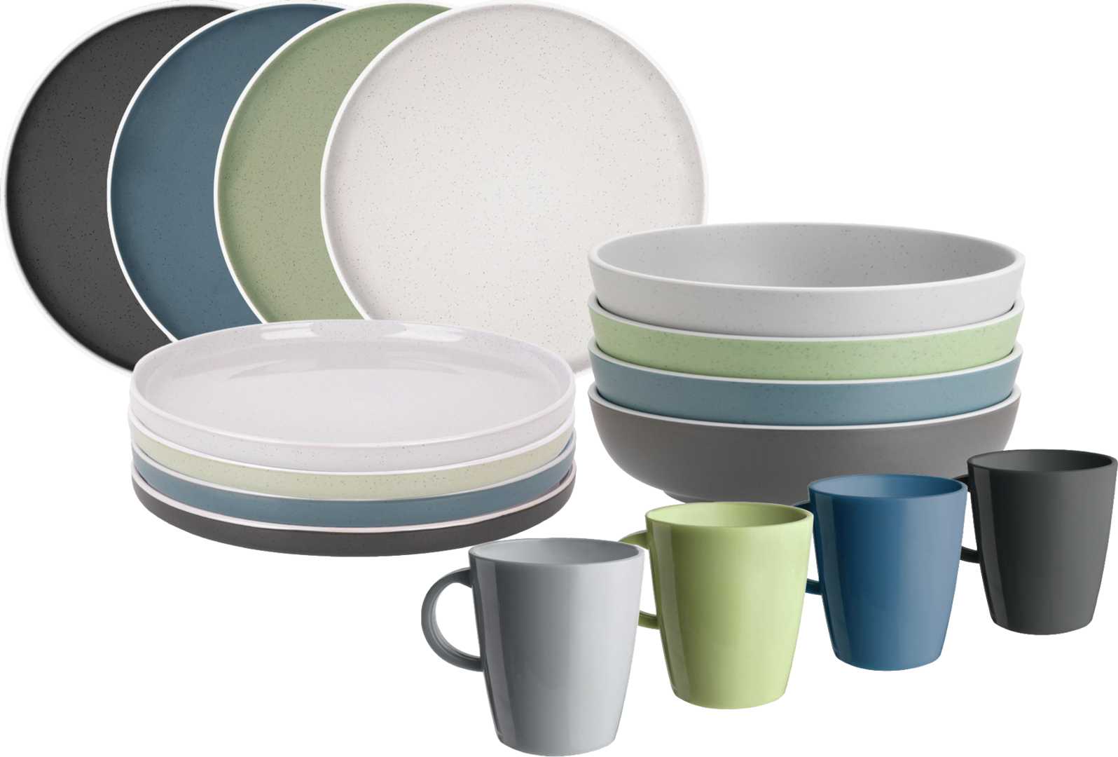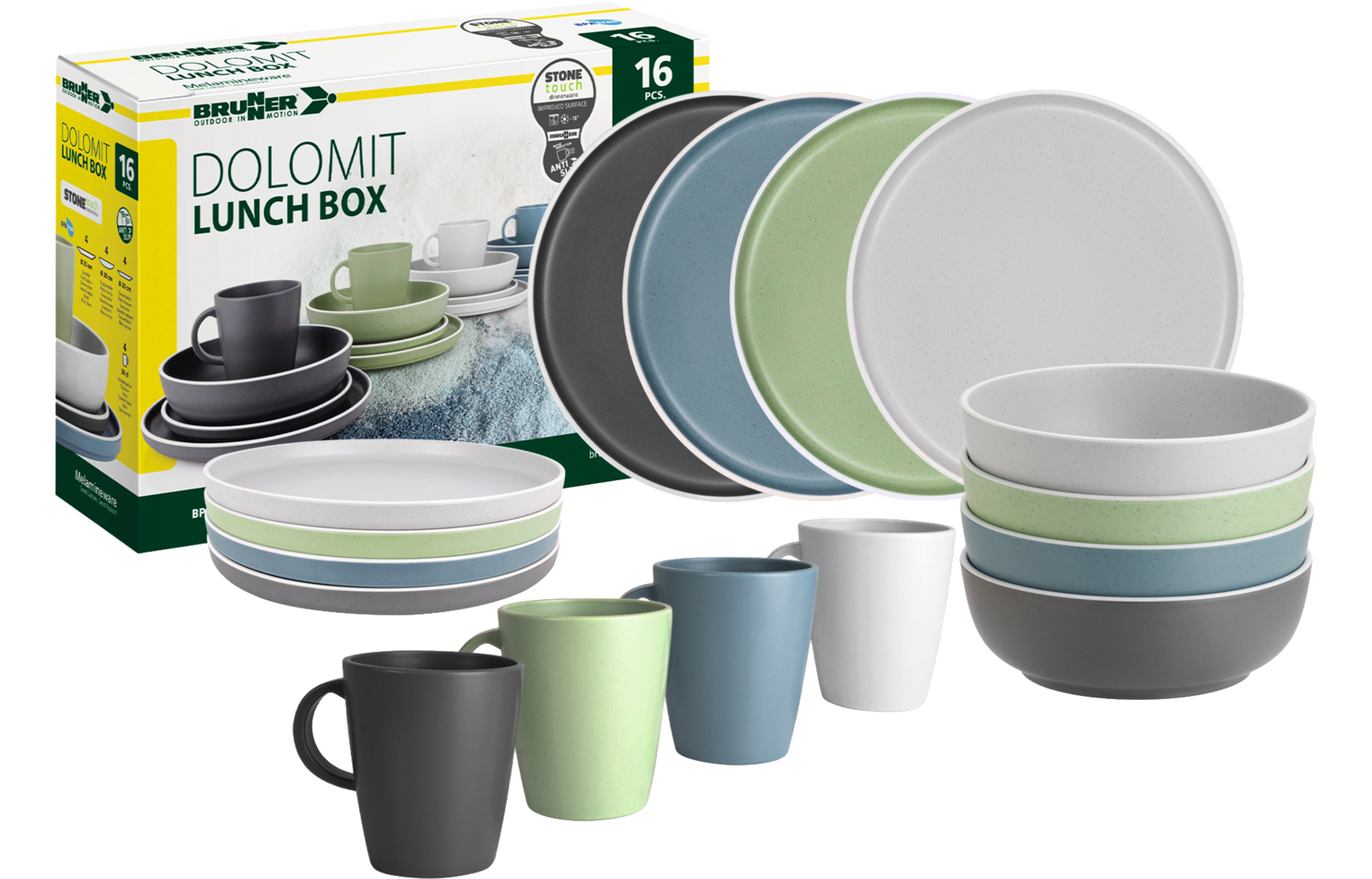Lunch Box DOLOMIT. 16-teiliges Set bestehend aus 4 Esstellern ø 26 cm, 4 Desserttellern ø 21 cm, 4 Suppentellern ø 21 cm und 4 Henkelbechern 30 cl.