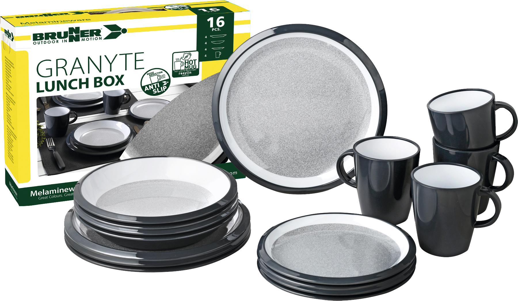 Lunch-Box GRANYTE. 16-teiliges Set bestehend aus 4 Esstellern ø 24,5 cm, 4 Suppentellern ø 21,5 cm, 4 Desserttellern ø 19,5 cm und 4 Henkelbechern 30 cl.