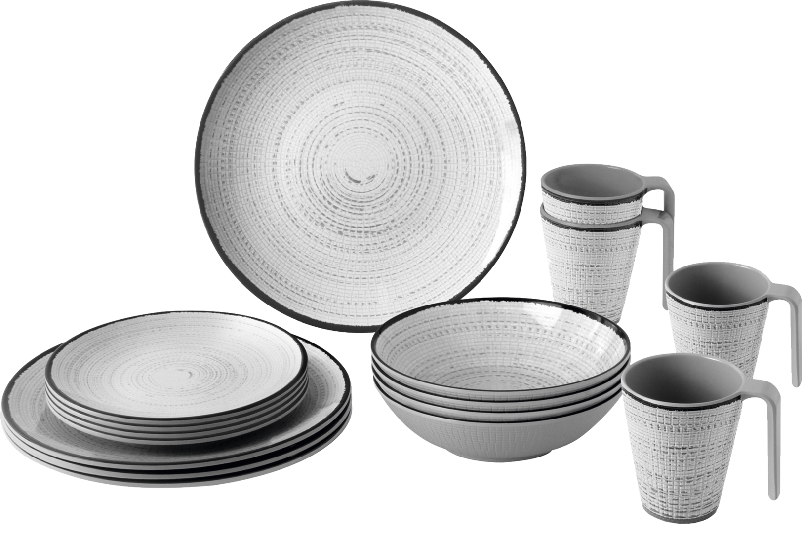 Lunch-Box TIVOLI. 16-teiliges Set bestehend aus 4 Esstellern ø 25 cm, 4 Suppentellern ø 21 cm, 4 Desserttellern ø 20 cm und 4 Henkelbechern 30 cl.