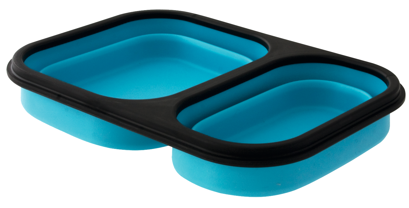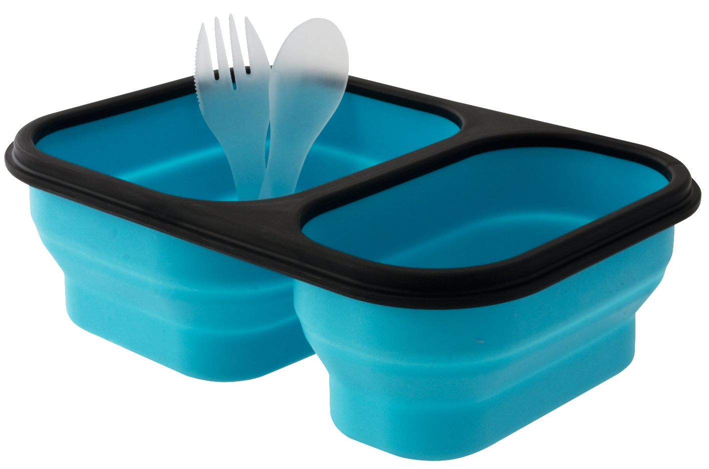 Faltbare Lunchbox mit Gabel und Löffel aus Silikon.