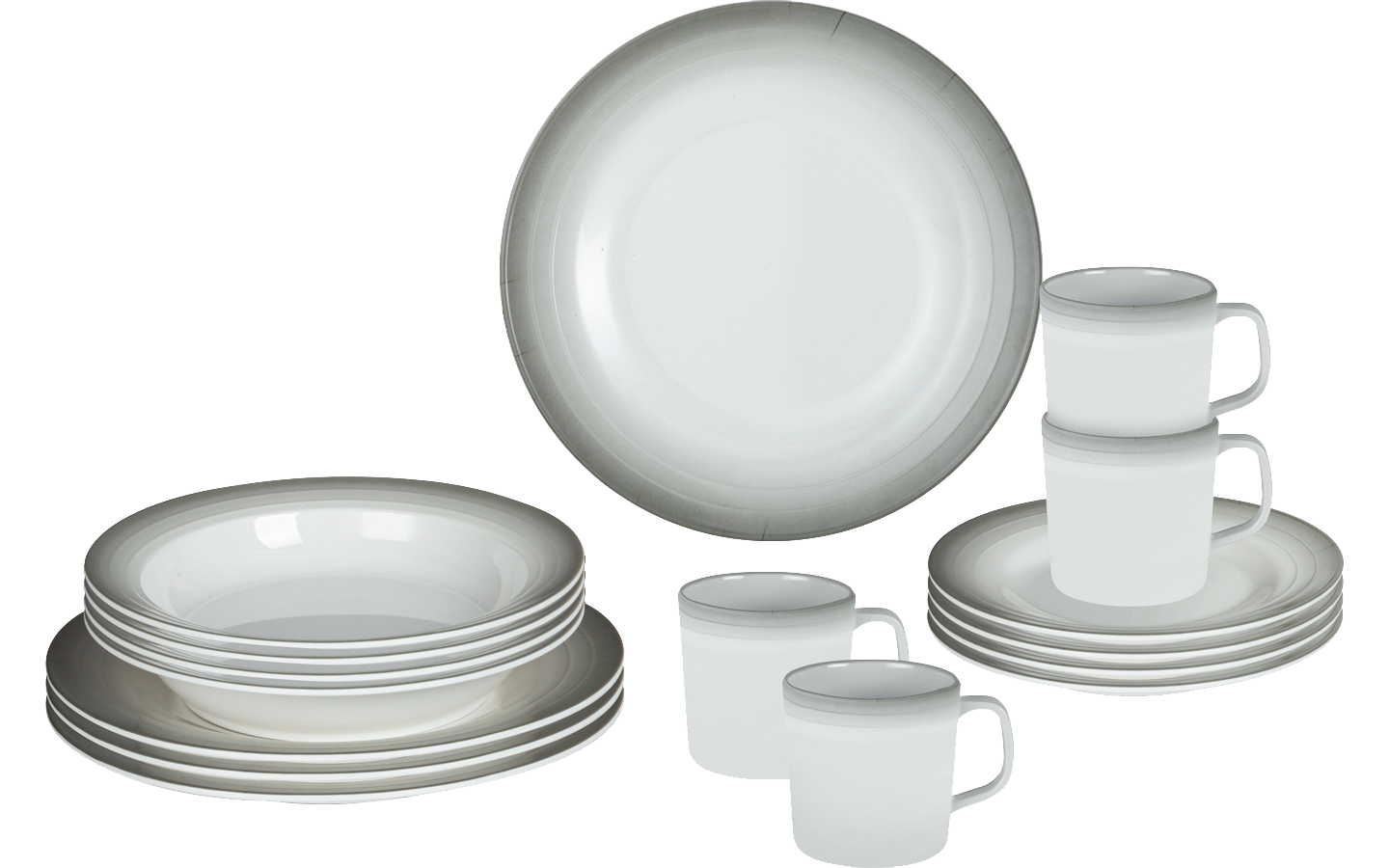 Melamin-Set ASTRALYS. 16-teiliges Geschirrset aus hochwertigem Melamin. Spülmaschinengeeignet, bruchunempfindlich, geruchs- und geschmacksneutral und lebensmittelecht. Nicht mikrowel-lengeeignet. Bestehend aus 4 Esstellern ø 25 cm, 4 Desserttellern ø 20 cm, 4 Suppentellern ø 22 cm und 4 Henkelbechern 30 cl.