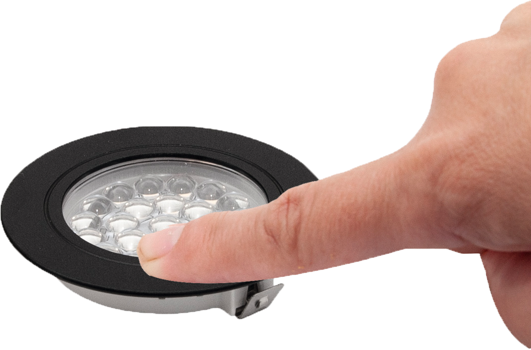 Aluminiumrahmen mit Polycarbonatlinse. Kabellänge 15 cm. Eingangsspannung 12 V. Leistung 2 W. LED-Typ 24 SMD. Lichtstrom 180 lm. Montageausschnitt ø 5,5 – 6 cm. Ausführung mit Touch Sensor.